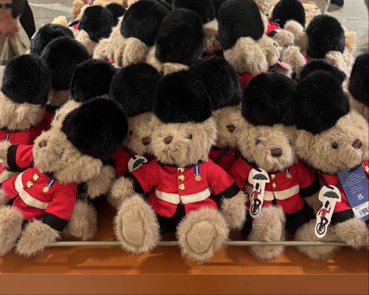 ハロッズで特に人気のお土産が、イギリスの伝統的な衛兵スタイルをモチーフにしたくまのぬいぐるみ。赤い制服に黒い帽子を被った姿は、まさに「ロンドンらしさ」満点で、お土産としても喜ばれること間違いなしです!