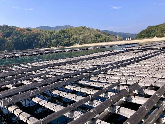 瀬戸内海の穏やかな海に浮かぶ牡蠣いかだ。