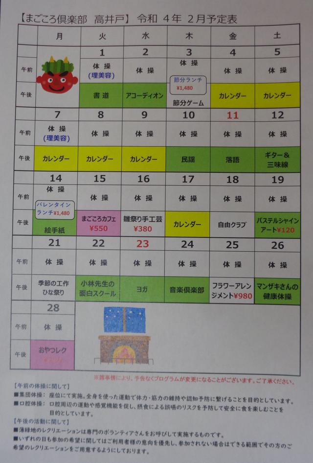 まごころ倶楽部高井戸 2月のレクの予定と献立です!